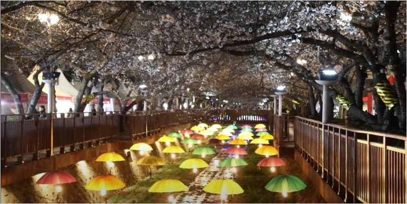 작은 개천 위로 흐드러지는 벚꽃은 낮에는 햇살과 함께 화사하게 빛나고, 밤에는 조명과 어우러져 환상적인 봄밤을 연출합니다. 시간대마다 다른 분위기를 느낄 수 있어 낮과 밤 모두 방문해 볼 가치가 있는 곳입니다.